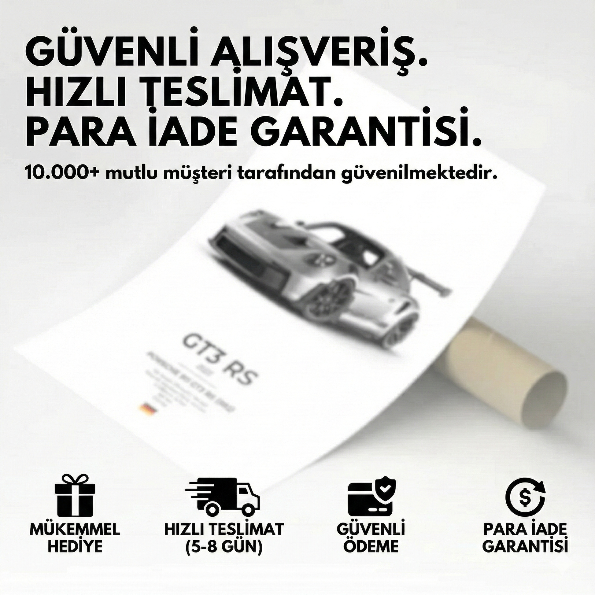 Posterlerimiz yüksek çözünürlüklü kanvas üzerine basılmıştır, bu nedenle her otomobil detayı net ve parlak görünür. Her biri gerçek performans istatistiklerini gösterir, bu da onu her otomobil tutkunu için özel kılar.